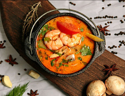 Большая порция. Бульон Том-ям, кокосовое молоко, кальмар копченный, курица или креветки на выбор, томаты, кинза, рисовая лапша, чеснок, имбирь, шампиньоны, лук репчатый.